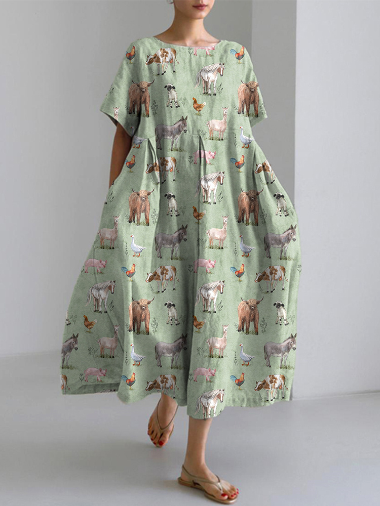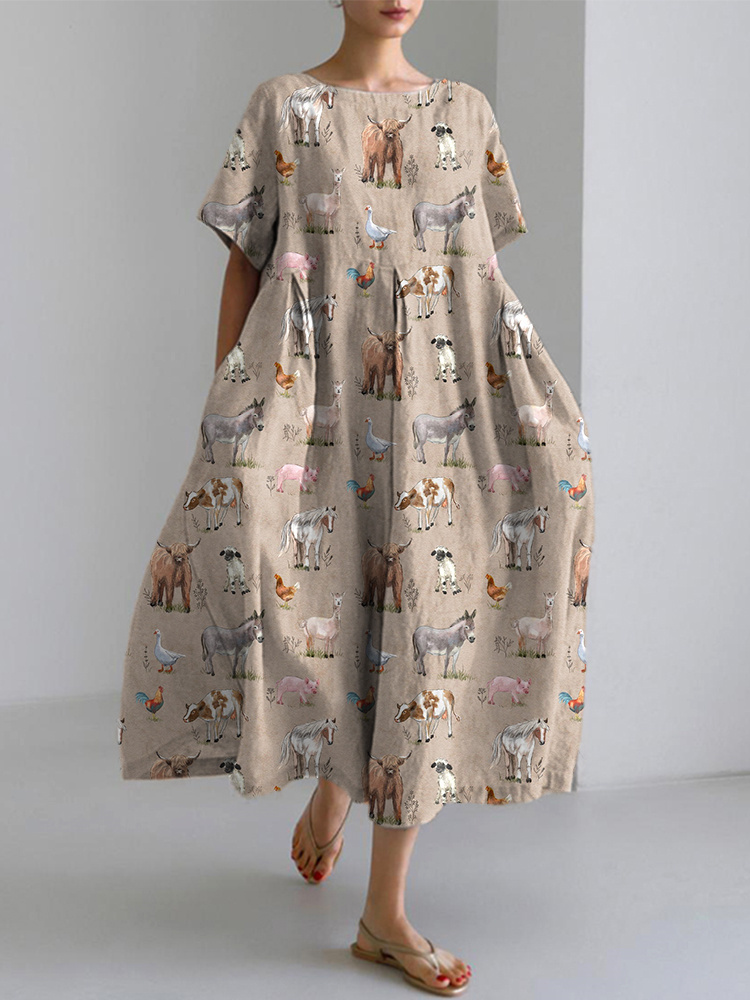 Vintage Farm Chicken Pattern Linen Blend Maxi Dress