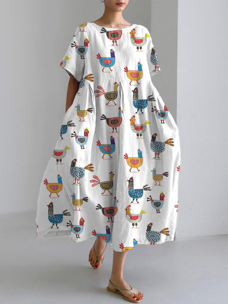 Funny Farm Chicken Embroidery Pattern Linen Blend Dress